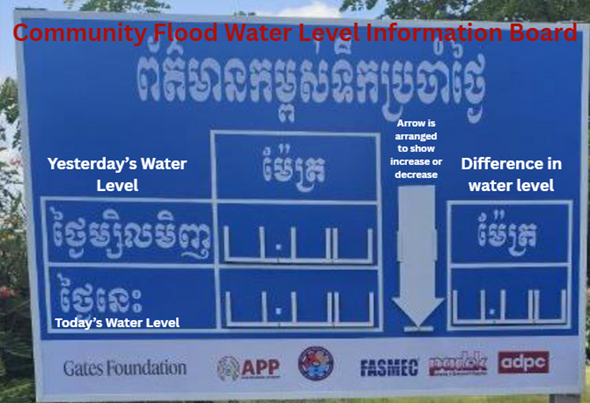Each flood marker displays the water level in centimeters, while the signage board is updated daily to show both the previous and current water levels. This comparison allows communities to monitor river level changes in real time.