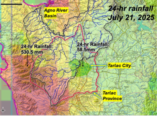 The assessment examined hydro-meteorological processes and flood impacts following intense rainfall from 20–22 July 2025. Satellite-derived data showed that 530.5 mm of rainfall fell within 24 hours in the mountainous areas of Tarlac Province on 21 July—equivalent to more than a month’s average July rainfall—while Tarlac City itself recorded only 58.5 mm. Despite lower local rainfall, severe flooding occurred due to upstream watershed dynamics, underscoring the need to monitor rainfall across the entire river basin, not only within barangay boundaries.